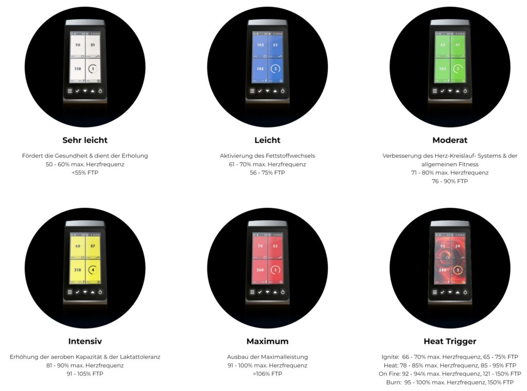 Die ICG Trainingszonen, bekannt als Coach By Color®, sind fünf Farbzonen (weiß, blau, grün, gelb, rot), die die Trainingsintensität auf ICG®-Geräten anzeigen. Diese Zonen basieren entweder auf der individuellen maximalen Herzfrequenz (HFmax) oder der individuellen FTP (Functional Threshold Power). Die Farben zeigen den Trainingszustand an, von der Erholung (weiß) bis zur maximalen Anstrengung (rot).