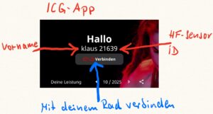 Um mit dem HF-Sensor zu trainieren musst du am Bike-Display dann später diese Nummer auswählen. Falls du die Nummer nicht findest, können wir vor der Stunde gemeinsam die Anmeldung am Rad machen. - ICG-App